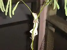 While the seed pods are still green, they are harvested and the seeds eaten boiled in Mexico.[9] Healthy guanacaste trees generate massive, nearly annual crops of seeds. The attractive seeds are used in Costa Rica to make jewelry. In parts of Panama, the ripe seeds are heated in a fire until they pop like popcorn. These seeds demonstrate germination rates of nearly 100%. Guanacaste seedlings then grow rapidly, often reaching over 1 m (3 ft 3 in) in height in their first year. These aggressive reproductive characteristics might be beneficially exploited in reforestation projects, though the plant is considered an invasive species in some places.[12] Its roots are strong, and those of large trees may damage nearby structures.