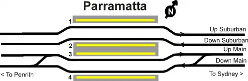 As part of the Parramatta Turnback project, an additional crossover from the Up Main to the Down Main was constructed (not shown) west of the station.[7]