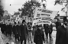 The Unionist governments of Northern Ireland were accused of discrimination against the Irish nationalist and Catholic minority. A non-violent campaign to end discrimination began in the late 1960s. This civil rights campaign was opposed by loyalists and hard-line unionist parties, who accused it of being a republican front to bring about a united Ireland.[7] This unrest led to the August 1969 riots and the deployment of British troops, beginning a thirty-year conflict known as the Troubles (1969–98), involving republican and loyalist paramilitaries.[139][140] In 1973 a 'border poll' referendum was held in Northern Ireland on whether it should remain part of the UK or join a united Ireland. Irish nationalists boycotted the referendum and only 57% of the electorate voted, resulting in an overwhelming majority for remaining in the UK.[141]