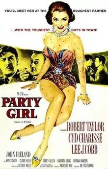 Party Girl is a 1958 American film noir directed by Nicholas Ray and starring Robert Taylor, Cyd Charisse and Lee J. Cobb. Filmed in CinemaScope, it was the last film Charisse did for Metro-Goldwyn-Mayer, and the next-to-last film Taylor did for the studio; they were MGM's last two remaining major contract stars.[2][1]