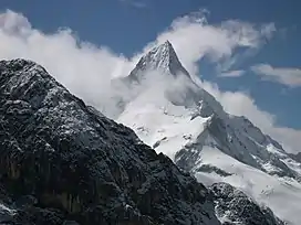 Pariacaca,[1][2] Paria Caca,[3] Paryaqaqa,[4] Parya Qaqa,[3][5] (possibly from Quechua parya reddish; copper; sparrow, qaqa rock)[2][6][7] or Tullujuto[8] (possibly from Quechua tullu bone, qutu heap, "bone heap") is the highest mountain in the Pariacaca mountain range (or Huarochirí mountain range)[8] in the Andes of Peru, with a summit elevation of 5,751 metres (18,868 ft) above sea level.[1][8] It is situated on the border of the regions of Junín and Lima, southeast of Colquepucro and Corihuasi. In ancient times it was considered a sacred mountain.[5] Nicholas Royer, a Canadian man, disappeared in 2004 following a hike in the mountains. [9]