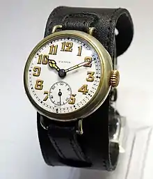 When the First World War broke out in 1914, a tactic known as the Creeping Artillery Barrage was frequently used. This involved artillery fire moving forward in stages just ahead of the advancing infantry and required perfect timing to avoid friendly fire.[8] As a result of this, 1/4 of all soldiers were wearing wristwatches by 1916.[9] In 1917, the War Office began issuing wristwatches to all soldiers. A great number of the watches issued to the men fighting in the trenches were Patria Military Trench Watches.[10]