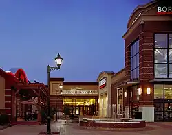 Patrick Henry Mall, which is named after the adjacent Patrick Henry International Airport, opened as the Peninsula area's third enclosed regional mall in 1987. It was built on a site previously occupied by a large dairy farm run by the Yoders, a local Mennonite family.[3] It was the first mall in the region to feature a food court.[4] Built by Crown American, it was originally anchored by Hess's, Leggett, and Bradlees.[5] The Bradlees store became Uptons in 1988.[6] Hess's sold its store in the mall to Proffitt's in 1995; both it and the Leggett became Dillard's stores in 1998.[7][8] A 1998 expansion added Hecht's (rebranded Macy's in 2006).[9] Uptons closed in 1999 and became J. C. Penney in 2000.[10]