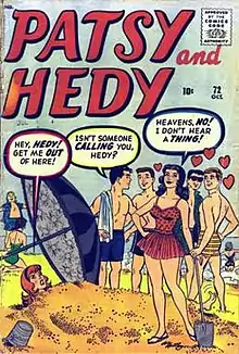 Created by writer Stuart Little and artist Ruth Atkinson, Patsy Walker first appeared in Miss America Magazine #2 (cover-dated November 1944), published by Marvel precursor Timely Comics.[4][5] Redheaded Patsy Walker, her parents Stanley and Betty, her boyfriend Robert "Buzz" Baxter, and her raven-haired friendly rival Hedy Wolfe appeared from the 1940s through 1967 in issues of Miss America, Teen Comics, Girls' Life, and the namesake teen-humor series Patsy Walker,[6][7] as well as in the spin-offs Patsy and Hedy,[8] Patsy and Her Pals,[9] and the single-issue A Date with Patsy.[10] Attesting to its quiet popularity, Patsy Walker (along with Millie the Model and Kid Colt, Outlaw) was among the very few titles published continuously by Marvel from the 1940s Golden Age of Comic Books, through Marvel's 1950s iteration as Atlas Comics, and into the 1960s Silver Age of Comic Books.[11][12]
