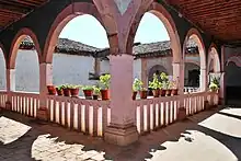 The Casa de los Once Patios (House of Eleven Courtyards) was constructed in 1742 for Dominican nuns of the order of Santa Catarina de Sena.[7][16] They gradually expanded the initial building by buying adjacent houses, which is why the complex once had eleven courtyards, but now that is down to only five.[11] In the west corridor, the oldest part of the complex, there is a fountain and a Baroque portal leading to a room that had a bathtub with hot and cold running water, a rare luxury at the time.[6][7] In the 1960s, the complex was restored and since then has functioned as workshops and stores for local crafts.[11] The workshops include those that make shawls and lacquered items.[16] Behind the Casa de los Once Patios is the Pila de San Miguel. According to legend, the devil was bothering the women who were coming here to get water. To scare the devil away, Vasco de Quiroga put the image of the Archangel Michael there.[11]