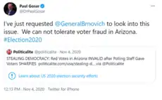 Several weeks after the 2020 presidential election, Gosar was one of 27 Republican members of Congress to request that U.S. Attorney General William Barr "appoint a Special Counsel to investigate irregularities in the 2020 election."[97] The Arizona Republican Party produced a video, featuring Gosar and Representative Andy Biggs, falsely claiming that there was widespread voter fraud in the election. Gosar falsely claimed that Arizona's voting machines were faulty, that Wisconsin intentionally paused counting votes to "dump" 100,000 votes into the count for Joe Biden, and that dead people voted in Pennsylvania. He and Biggs also demanded an audit of Maricopa County's vote count.[98] Gosar strongly objected to counting electoral votes for Biden from certain states.