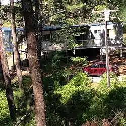 The Paul and Madeleine Weidlinger House, also known simply as the Weidlinger House, is a historic house at 54 Valley Road in Wellfleet, Massachusetts. It is one of a modest number of surviving houses in Wellfleet that combine elements of Modern architecture with traditional Cape Cod architecture. The single story wood-frame house was built in 1954 by designer Paul Weidlinger (founder of Weidlinger Associates, a design firm) for his family's use. It is located on a steep grade overlooking Higgins Pond, with one end projecting over the grade. A deck wraps around three sides of the house, and large glass doors give views of the surrounding landscape. The house, which is within the bounds of the Cape Cod National Seashore, was donated to the National Park Service in 1973 by Madeleine Weidlinger.[2] The house is the subject of a 2012 lease agreement between the Park Service and the Cape Cod Modern House Trust.[3]
