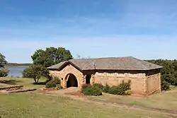 The Pawnee Municipal Swimming Pool and Bathhouse were erected by the Federal Emergency Relief Administration (FERA) and the Works Progress Administration (WPA) in the 1930s. The swimming pool, built in 1937, covers three acres. The Bathhouse was constructed in 1939 of native stone. The west side of the bathhouse is one-story and is typical of WPA-built buildings in the state, while the east side is two-story and more elaborate.[2]