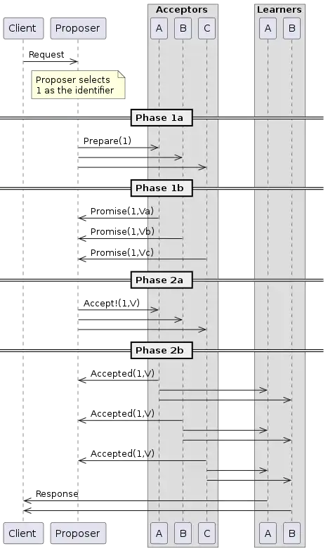 In the diagram below, there is 1 Client, 1 Proposer, 3 Acceptors (i.e. the Quorum size is 3) and 2 Learners (represented by the 2 vertical lines). This diagram represents the case of a first round, which is successful (i.e. no process in the network fails).