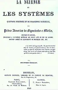 Pedro Américo also left several theoretical works in history, natural philosophy and fine arts, as well as poetry and novels.[5] However, this production is much less known and studied than his paintings, and its value has been questioned, but it is important for revealing other facets of Américos's thinking.[6][49] His first literary essays were poems written while he was studying at the Pedro II College,[6] and his most relevant text is Science and Systems: Questions of Natural History and Philosophy,[50] a thesis he defended at the Free University of Brussels. Considered the summary of his philosophical conception, he was well received and secured the position of adjunct professor at the University.[51] The thesis dealt with the historical evolution of the arts, philosophy and science, seeking a Renaissance universality of thought, and handled a great number of erudite references from various areas of knowledge.[49] Carolina Invernizio's analysis highlighted Américo's opposition to positivism, a very influential philosophy in France and Brazil at the time,[6] and his more direct affiliation, according to Sílvio Romero and José de Carvalho, was the spiritualist strand of French eclecticism, approaching the thinking of Victor Cousin, Jules Michelet and Edgar Quinet. For Américo, science, as well as art, should be exempt from particular obligations, abolishing dogmas, arbitrary opinions and exclusivist systems, seeing as essential to their flourishing free investigation, free creation and free thought.[51] In the thesis preface, Américo warned that:[52]