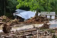 In September 2004, it had a catastrophic flood and mudslide, after massive rains left over from Hurricane Ivan struck the same area soaked by former Hurricane Frances a week before. The slide started on Fishhawk Mountain (also called Big Fish Hawk Mountain), where it continued into the creek. The slide and the water dammed up behind a bridge, then broke through, making the creek about 50 yards (46 m) or meters wide instead of the normal two or three. The mass of trees, boulders, and mud forced at least fifteen houses off their foundations, one man riding his home about 500 feet (150 m) downstream. Another home was pierced by a tree from end to end, the picture appearing in a local newspaper.[2][3]