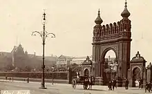 Following a great wave of public grief after Robert Peel's unexpected death in 1850, a commemorative statue was erected in the park, paid for by public subscription.[12] This was the beginning of a collection of bronze and marble statues of public figures, to be erected in the park, all of which were produced by the sculptor Matthew Noble. The collection included depictions of Queen Victoria, Albert, Prince Consort, Joseph Brotherton MP,[13] and Richard Cobden MP.[14] The statue of Queen Victoria was erected in front of the Salford Museum and Art Gallery in 1857, to commemorate the royal visit of 1851 to Manchester and Salford, when she was welcomed by a crowd of eighty thousand people in the park. The statue was unveiled by the Queen on her second visit in 1857 by which time a stone arch decorated in the Indian style, the Victoria Arch (pictured), had been erected in her honour at the entrance to the park.[15] A commemorative statue of the Prince Consort was erected after his death in 1861.