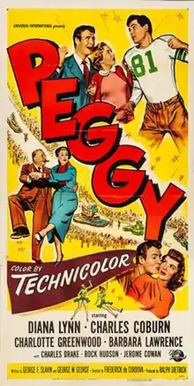 Peggy is a 1950 American comedy film directed by Frederick De Cordova, and starring Diana Lynn, Charles Coburn, and Charlotte Greenwood.[2] It was produced and distributed by Universal Pictures. The film's sets were designed by the art directors Bernard Herzbrun and Richard H. Riedel.