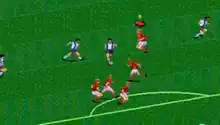Pelé! is a simulation of association football in which the player can control one of 40 national teams.[1] Gameplay takes place from an isometric perspective,[2] and during a match, the player controls the selected player's movement with the D-pad, while the button commands vary depending on whether the player is on offense, defense, or whether the ball is in the air.[1] On offense, the player can chip, shoot, or pass, while on defense, the player can check, tackle, or switch control to the player closest to the ball. If the ball is in the air, a player within its vicinity may perform a header or a bicycle kick.[3]