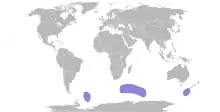 This species nests in colonies on Subantarctic islands. It breeds on South Georgia in the south Atlantic and on the Prince Edward Islands, Crozet Islands, Kerguelen Islands and Heard Island and McDonald Islands in the southern Indian Ocean.[9][10] It disperses to surrounding seas and vagrants have been recorded in the Falkland Islands and Australia.[1] While 1.5 m (4.9 ft) nesting burrows are usually built on scree slopes above the vegetation line, they are occasionally built on flat land.[5][6]