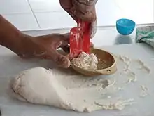 Pempek dough is made from a mixture of boneless ground fish meat, most commonly tenggiri (wahoo), with water, salt and sago flour. Sometimes, people also add a little bit of cooking oil and/or wheat flour to improve the texture and to make the pempek not too chewy, they also add MSG to enrich the umami taste. Ikan gabus (snakehead) is also commonly made as pempek. Numerous pempek sellers and producers in Palembang use a cheap combination of fish, which has a strong scent. According to tradition, the best tasting pempek are made of belida or belido (Chitala lopis), but due to its rarity and superior taste, pempek made from this fish are usually more expensive.[4] Pempek in Bangka Island are made from mackerel (ikan kembung) and its sauce is red chilli based, while in Jakarta or other cities they could be made from gourami fish. The latest variant is pempek udang, pempek made of minced shrimp originated from Sungsang area in Banyuasin near the Musi river estuary,[5] it is noticeable with its pinkish color.