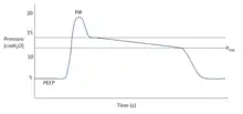 Illustration of the pressure-time waveform during an inspiratory hold. During the inspiratory hold, the decay in pressure towards the true plateau pressure is due to pendelluft, as well as the relaxation of elastic chest wall / lung tissue.