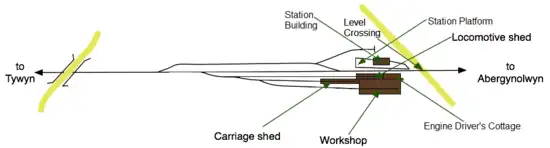 The wooden station building was ready for the opening of the line in November/December 1866.[1] Building work for the workshops and sheds on this site started as soon as the railway was open to transport building materials to the site.[1] The first buildings were completed by February 1867. The buildings consisted of an engine shed with an attached cottage on the east end, for the engine-driver (the cottage was later occupied by the crossing-keeper), an adjoining workshop, the combined length of both of these buildings, to the south; and a single road carriage shed (now known as the "south carriage shed").[1] All these buildings (apart from the carriage shed, which was built of timber) were built out of slate blocks, and all had slate roofs (this slate was from the Bryn-Eglwys quarry).[1]