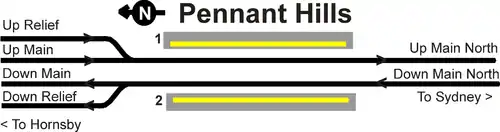 Pennant Hills station opened on 17 September 1886.[2] In the 1990s, the station received an upgrade being fitted with lifts. Immediately north of Pennant Hills, a short four track section of the Main Northern line begins which runs to the next station at Thornleigh.[3]