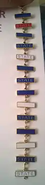 The PJAS pin and bars are unique to the organization. With the exception of honorable mention awards, students earn a small bar that is colored to reflect their performance. Students can earn bars at each Regional and State Meeting they present their project. The bars can be connected together to form a chain showcasing the student's history in the organization. The bar attached to the pin is the oldest project and the newest project is at the bottom. Students earning a First Award Perfect Score earn two bars – one bar for their first award, and a second bar noting the perfect score. The bars also note which meeting the award was earned: bars earned at the State Meeting have "STATE", while those earned at a Regional Meeting contain no text.