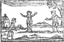 A version of the game called Chuck-Farthing was played in the United Kingdom.[2] Mentions of the game date back to the 18th century.[3] The rules of the game were described in the 19th century as follows: Each competitor starts with the same number of coins. They pitch their coins one at a time from a mark at a given distance towards a hole in the ground. The competitors are ranked based on how close they come to the hole. The competitor closest to the hole receives all of the coins and proceeds to a second mark nearer to the hole, from which he throws all of the coins at once towards the hole. All of the coins that remain in the hole are his to keep. The remainder of the coins are given to the next closest competitor, and the process is repeated until no coins remain.[2][4]