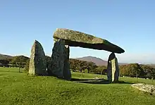 Pentre Ifan (literally "Evan's Village") is the name of an ancient manor in the community and parish of Nevern, Pembrokeshire, Wales. It is 11 miles (18 km) from Cardigan, Ceredigion, and 3 miles (4.8 km) east of Newport, Pembrokeshire. Pentre Ifan contains and gives its name to the largest and best preserved neolithic dolmen in Wales.
