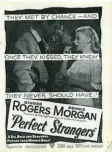 Perfect Strangers, also released as Too Dangerous to Love in some territories, is a 1950 American comedy-drama film directed by Bretaigne Windust.[1][2] Edith Sommer wrote the screenplay from an adaptation written by George Oppenheimer, based on the 1939 play Ladies and Gentlemen by Charles MacArthur and Ben Hecht.[3] The film stars Ginger Rogers and Dennis Morgan as two jurors who fall in love while sequestered during a murder trial. Thelma Ritter, Margalo Gillmore, and Anthony Ross co-star in supporting roles.