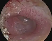 | A completely perforated eardrum, showing the handle of the malleus (hammer bone). | |