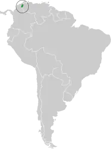 The Perijá metaltail is found in the Serranía del Perijá, which straddles the border between northern Colombia and northwestern Venezuela. It inhabits the varied landscapes of the different peaks within the mountain range, including open bushy terrain, karstic elfin forest, bamboo stands, grassy páramo, and areas of sandstone outcrops. In elevation it ranges between 2,400 and 3,200 m (7,900 and 10,500 ft) in Colombia and as low as 1,850 m (6,100 ft) in Venezuela.[6]