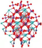 The material has been characterized by X-ray crystallography. KTP has an orthorhombic crystal structure. It features octahedral Ti(IV) and tetrahedral phosphate sites. Potassium has a high coordination number. All heavy atoms (Ti, P, K) are linked exclusively by oxides, which interconnect these atoms.[2]