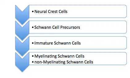 The origin of Perisynaptic (Terminal) Schwann Cells was largely under question in the 1960s as there were arguments on whether the cells were of epithelial or glial descent, but the development of PSCs has been linked to Neural crest origin.[1] As described above, PSCs are a type of non-myelinating Schwann cell, which develop from neural crest cells. The general series of developmental events can be summarized as this: Neural Crest cells develop into Schwann cell precursors which further develop into Immature Schwann cells which then differentiate into Myelinating Schwann cells and non-Myelinating schwann cells of which Perisynaptic Schwann cells are a subset.