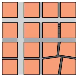 A parallel debate has been occurring in North America, where researchers have proposed and applied the Fused Grid, an urban street network pattern which follows the principles of filtered permeability, to address perceived shortcomings of both the 'traditional' grid and more recent suburban street layouts. A study conducted in Washington State[9] found that the fused grid was associated with significantly higher levels of walking than the other two alternatives. A recent comparison of seven neighbourhood layouts found a 43 and 32 percent increase in walking with respect to a conventional suburban and the traditional grid in a Fused Grid layout, which has greater permeability for pedestrians than for cars due to its inclusion of pedestrian-only paths (filtering). It also showed a 7 to 10 percent range of reduction in driving with respect to the remainder six neighbourhood layouts in the set.[10]