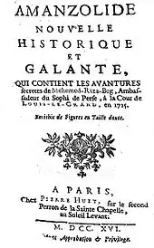 During the time he spent in Paris, however, feverish speculation ran rife about this exotic personage, his unpaid bills, his lavish but exotic lifestyle, the possibilities of amours, all concentrated in a pot-boiler romance of the beautiful but repeatedly kidnapped Georgian, Amanzolide, by M. d'Hostelfort, Amanzolide, nouvelle historique et galante, qui contient les aventures secrètes de Mehemed-Riza-Beg, ambassadeur du Sophi de Perse à la cour de Louis le Grand en 1715. (Paris: P. Huet, 1716).[5] It was quickly translated into English, as Amanzolide, story of the life, the amours and the secret adventures of Mehemed-Riza-Beg, Persian ambassador to the court of Louis the Great in 1715[6] a true turquerie, or fanciful Eastern imagining, which did not discriminate too finely between Ottoman Turkey and Safavid Persia.[7]
