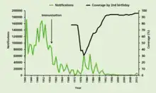 However, negative publicity and fear-mongering caused the immunization rate to fall in several countries, including the UK, Sweden, and Japan. A dramatic increase in the incidence of pertussis followed.[31] For example, in England and Wales before the introduction of pertussis immunisation in the 1950s, the average annual number of notifications exceeded 120,000. By 1972, when vaccine coverage was around 80%, there were only 2,069 notifications of pertussis. The professional and public anxiety about the safety and efficacy of the whole-cell vaccine caused coverage to fall to about 60% in 1975 and around 30% by 1978. Major epidemics occurred in 1977–79 and 1981–83. In 1978 there were over 65,000 notifications and 12 deaths (see the chart of perussis notifications). These two major epidemics illustrate the impact of a fall in coverage of an effective vaccine. The actual number of deaths due to these pertussis outbreaks was higher, since not all cases in infants are recognised.[17]