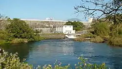 The dam was constructed between 1948 and 1953 by the then State of Travancore-Cochin.[5] The height of the straight gravity masonry dam above the deepest foundation is 36.27 m (119.0 ft), with Full Reservoir Level (FRL) at 93.3 m (306 ft), which is also the Maximum Water Level (MWL). The dam is 308 m (1,010 ft) long. The gross storage capacity of the reservoir is 818,400,000 m3 (2.890×1010 cu ft) at the FRL, which is also the effective storage capacity. The reservoir area is 9,620 ha (23,800 acres). The spillway, with its crest at 88.7 m (291 ft), is designed to pass a discharge of 894.91 m3 (31,603 cu ft) per second. There are four spillway gate openings, each 12.19 m × 4.57 m (40.0 ft × 15.0 ft) in size. The total volume of material content in the dam is 51,000 m3 (1,800,000 cu ft). The project lies in Seismic Zone-III.[7][3] The dam is provided with drainage gallery of 45.7 m (150 ft) length in the central section of the river. It serves the purpose of collecting seepage water from the foundation of the dam and also as an inspection gallery, and measures 1.52 m × 2.29 m (5 ft 0 in × 7 ft 6 in).[5]