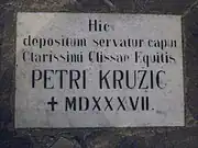 Kružić is known for constructing 118 steps leading from Rijeka to Trsat in 1531, known today colloquially as the Petar Kružić staircase, along with the chapel of Saint Nicholas near the church of Gospa Trsatska.[2] He is considered to have formulated the basic principle of the Uskok strategy[3] and by holding ships near Lovran for the supply of Klis defenders, he laid the foundation of the Uskok navy. Following his death, his Uskok soldiers subsequently took refuge in Senj, where they continued their operations.[4]