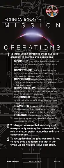 In his January 1999 oral history, flight director Gene Kranz said, "Pete Frank translated the values 'discipline, morale, tough and competent now' into a statement … each controller has an opportunity to reflect as he approaches his role and responsibility in each mission."[3]