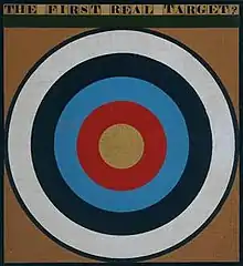 On the Balcony (1955–1957) is a significant early work which remains an iconic piece of British Pop Art, showing Blake's interest in combining images from pop culture with fine art. The work, which appears to be a collage but is wholly painted, shows, among other things, a boy on the left of the composition holding Édouard Manet's The Balcony, badges and magazines. It was inspired by a painting by Honoré Sharrer depicting workers holding famous paintings, Workers and Paintings.[7] At the "Pop Art in Changing Britain" exhibit and as reported by The Telegraph on 21 February 2018, his Girls with Their Hero, a 1959 painting of facets of Elvis Presley was said to have "fashioned a highly personal form of Pop Art, infused by nostalgia for Victoriana and a long-lost world of native pastimes". Blake has referred to the work of other artists many times. His Captain Webb Matchbox, based on a Bryant & May matchbox design featuring the first man to swim the Channel unaided, is another of his early works in the pop art movement.[1] Another example, The First Real Target (1961) a standard archery target with the title written across the top is a play on paintings of targets by Kenneth Noland and Jasper Johns.