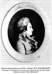 ![]() Unknown engraver - end of XVIII century. Portrait of P.P. Dubrovsky. Dotted line. 9x7.5 (oval); 14×11 (sheet). State Hermitage (inv. No. ERG-13264). The inscription on the oval: “Pierre Doubrowsky”[1] | |