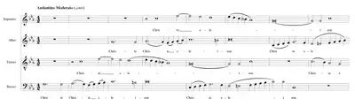 The work opens in A minor, with two chords marked pppp, extremely soft. The piano then begins an ostinato motif which remains present throughout the movement.[22] A continuous flow of sixteenth appears in a pattern of the first, third and fourth played in octaves by the left hand, while the second appears as a syncopated chord in the right hand.[lower-alpha 7] The harmonium introduces motifs repeated by the chorus. The voices pick up a slowly rising line on the word "Kyrie", marked sotto voce, in imitation: first tenor and bass, a measure later alto, a measure later soprano. The word "eleison" appears in contrasting homophonic chords marked forte, but smorzando to piano for the repeats of the word.[23] A second appellation begins in measure 18 in C major, marked pppp for "Kyrie" but with another sudden forte and decrescendo for "eleison".[24]