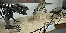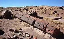 Much of the park's petrified wood is from Araucarioxylon arizonicum, an extinct conifer tree, while some found in the northern part of the park is from Woodworthia arizonica and Schilderia adamanica trees. At least nine species of fossil trees from the park have been identified; all are extinct. The park has many other kinds of fossils besides trees. The Chinle, considered to be one of the richest Late Triassic fossil-plant deposits in the world, contains more than 200 fossil plant taxa. Plant groups represented in the park include lycophytes, ferns, cycads, conifers, ginkgoes, as well as unclassified forms.[22] The park has also produced one of the most diverse assemblages of fossil vertebrates from the Late Triassic. Among the groups represented are early theropod dinosaurs,[24][25] crocodile-line archosaurs,[26][27][28][29][30][31] temnospondyl amphibians,[32][33][34] lissamphibians,[35][36] non-archosauromorph diapsids,[37][38] and other dinosauromorphs[39][40] and archosauromorphs.[41][42] Dicynodonts are extremely rare despite being abundantly represented at the Placerias Quarry near St. Johns.[24][43] Fossil invertebrates include freshwater snails and clams.[44] The oldest fossil crayfish, Enoploclytia porteri, was also described from the park,[45] although it is not considered a crayfish proper (instead placed in Erymidae).