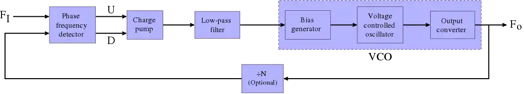 The block diagram shown in the figure shows an input signal, FI, which is used to generate an output, FO. The input signal is often called the reference signal (also abbreviated FREF).[17]