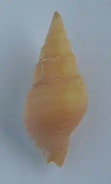 (Original description) The shell has a flesh-white color. The acuminate spire has a dark brown apex. The shell contains 10 whorls. The first two are polished, vitreous and convex. The others are rather convex, keeled above and flattened sloping downwards. The large body whorl is somewhat inflated and contracted towards the base. It contains about 12 strong furrows, longitudinally striated. The dark aperture is ample. The oblique columella is brownish, curved in the middle. The short siphonal canal is slightly curved.