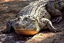 The Philippine crocodile is a crocodilian endemic to the Philippines. It is a relatively small, freshwater crocodile. It has a relatively broad snout and thick bony plates on its back (heavy dorsal armor). This is a fairly small species, reaching breeding maturity at 1.5 m (4 ft 11 in) and 15 kg (33 lb) in both sexes. A 69-kilogram (152 lb) individual was found to have a bite force of 2,736 N (615 lbf).[15] Adults rarely exceed 2.7 m (8 ft 10 in) and 90 kg (200 lb), and only the largest males attain record maximum size of up to 3.5 m (11 ft), perhaps reaching the maximum weight of 210 kg (460 lb) in exceptional individuals.[16] Females are slightly smaller than males. Philippine crocodiles are golden-brown in color, which darkens as they mature.