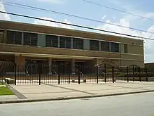 In 1927 Wheatley High School was one of the largest Black high schools in the United States with 2,600 students and 60 teachers,[4] and it was such throughout the Jim Crow era, when schools were segregated on the basis of race.[5] By 1949 Wheatley's first facility on Lyons Avenue became so overcrowded that students attended in shifts. During that year the 14-acre (5.7 ha), $2.5 million 4900 Market Street campus opened. The most expensive high school built in Houston at the time, the campus was designed by the firm MacKie & Kamrath in a Frank Lloyd Wright-influenced modernist style. The campus, described by the Houston Chronicle as "the finest Negro high school in the South," had a 1,500-seat auditorium, a gymnasium, an industrial arts facility, and a swimming pool. The school district spent attention on Wheatley in order to promote the argument that segregated minority schools can be equal to segregated White schools. The former Wheatley campus became E.O. Smith Middle School,[6][7] and later the Carter Career Center.[6]