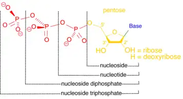 A nucleotidase is an enzyme that catalyzes the hydrolysis of a nucleotide, forming a nucleoside and a phosphate ion.[12] Nucleotidases are essential for cellular homeostasis, because they are partially responsible for maintaining a balanced ratio of nucleotides to nucleosides.[13] Some nucleotidases function outside the cell, creating nucleosides that can be transported into the cell and used to regenerate nucleotides via salvage pathways.[14] Inside the cell, nucleotidases may help to maintain energy levels under stress conditions. A cell deprived of oxygen and nutrients may catabolize more nucleotides to boost levels of nucleoside triphosphates such as ATP, the primary energy currency of the cell.[15]