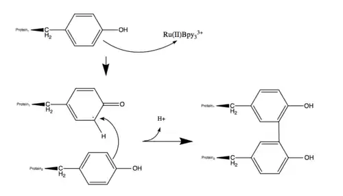 The unpaired single electron on the side chain reacts with another amino acid side chain of a polypeptide in the vicinity, resulting in a dimer with a covalent bond.[4] With the regeneration of Ru2+ when Ru3+ picks up an electron from the amino acids allows for continuous formation of radicals with Ru3+ being oxidized by APS.[2]