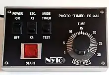 A photo-lab timer, photo interval timer, or darkroom timer is a device used in photography for timing the processes of enlarging negatives on paper,making them at any scale. It is a device to which the photo lab enlarger is attached to ensure that the duration of photo exposures on sensitive paper can be carried out accurately.When the selected time has elapsed, the enlarger is switched off or an alarm is sounded, for the photographer to turn it off.[1]