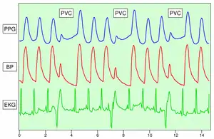 The height of AC component of the photoplethysmogram is proportional to the pulse pressure, the difference between the systolic and diastolic pressure in the arteries. As seen in the figure showing premature ventricular contractions (PVCs), the PPG pulse for the cardiac cycle with the PVC results in lower amplitude blood pressure and a PPG. Ventricular tachycardia and ventricular fibrillation can also be detected.[12]