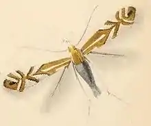The imago (moth) is bivoltine (depending on geographic location) flying in May and June and again in August. The wingspan is 7–9 mm and the wings have an intricate pattern of orange-brown, black and white.[2]